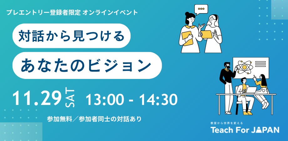 Teach For Japanは、「すべての子どもが、素晴らしい教育を受けることができる世界の実現」をビジョンに活動する認定NPO法人です。Teach For Japanでは、団体が掲げるビジョンのもとで一人ひとりが自分自身のビジョンや教育への想いを描き、向き合い、それを軸としながら活動することを大切にしています。