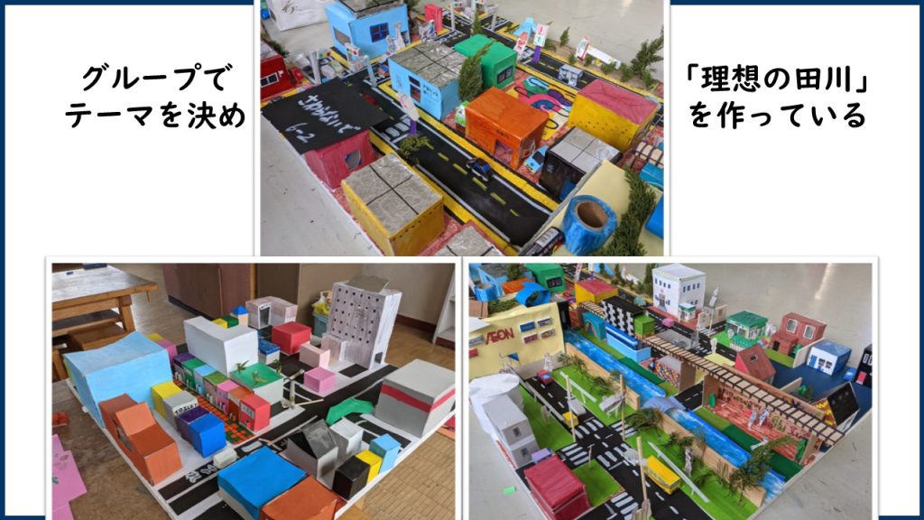 6年生の時にコロナになったので、総合的な学習の時間についても大きく変えたいなということで、「田川の魅力と課題」「住みやすい街(多様性)」「今の自分にできること(自己分析・他己解析)」を学びながら、「理想の田川」について考える機会を作りました。最終的にはグループでテーマを決め、1ⅿ×1ⅿの発泡スチロールの板に理想の田川を作りました。それを小学校や進学する中学校の校長先生や、街の皆様に審査をしていただきました。