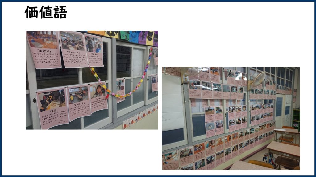 価値語というのを、教室に貼りだしていました。本日来てくれた生徒が持って来てくれていて、大切に残してくれているんだなというのが嬉しいですね。これは、生徒たちの写真を撮って、そこに先生としての私の言葉を書いたものです。日常を写真と言葉で価値づけ、子どもたちの中で手本ができること、そして思い出になることだと思い行っていました。
