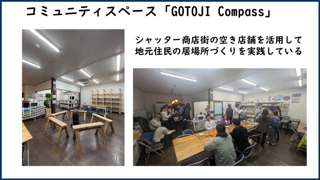 今日まさに私たちがいる場所は、コミュニティスペース「GOTOJI Compass」といいまして、シャッター商店街の空き店舗を活用して、地域住民の居場所作りを実践している場所となります。ここでは、生徒たちが自習をしたり、大学生が小学生に勉強を教えたり、月に1度集まって飲み会をしたり、さまざまな活動をしています。