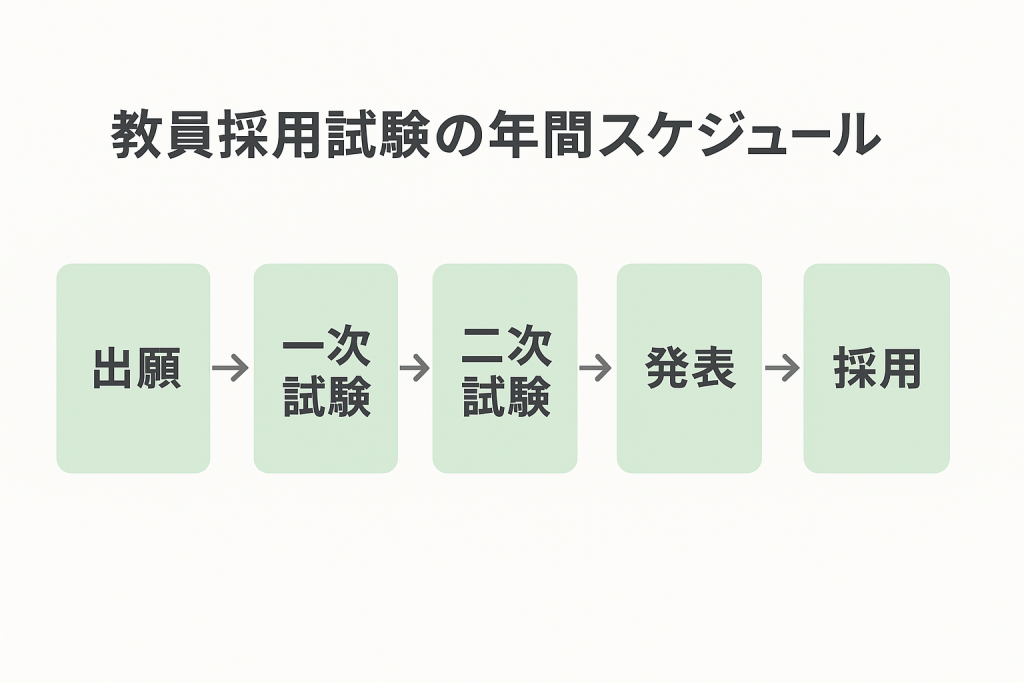教員採用試験は、例年春〜夏に出願・一次試験、秋に二次試験・合格発表という年間サイクルで進行します。