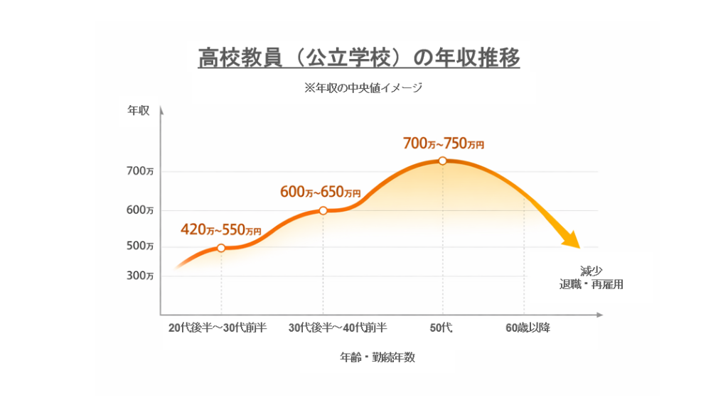 50代以降の教員は、長年の勤続による等級・号給の上昇、役職・管理職経験(教頭・副校長等)を経ることで、給与が高水準になる傾向があります。一般労働者全体の統計では、50代以降の平均年収がピークに達する傾向があり、公立高校教員でも同様に高い年収帯が見られます。