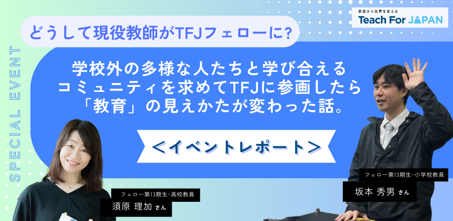 今回は、現役の教師でありながらTeach For Japan(以下、TFJ)のフェローシップ・プログラムに参加され、第13期生として活動中の須原理加さん、坂本秀男さんに登壇いただき、今なぜTFJに参画しようと思ったのか、プログラム参加からの変化や得たものなどについて語っていただきました。ぜひ最後までご覧下さい。