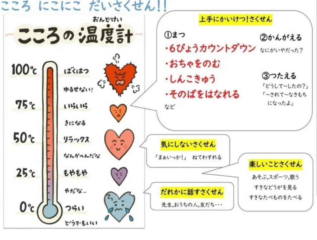 1つ目は、クラス全体へ向けたアプローチで、感情の可視化とコントロールのアイデア募集です。例えば、「列に並んでいたとき友達に抜かされたらどう感じる?」というお題を出して、児童ひとりひとりに温度計で怒り度合いを表示してもらいました。同じ事象でも人によって感じ方が違うと知ってもらうために可視化したのです。次に、「怒りが爆発しそうなときみんなだったらどうする?」というアイデアを書いてもらい教室に貼り出しました。