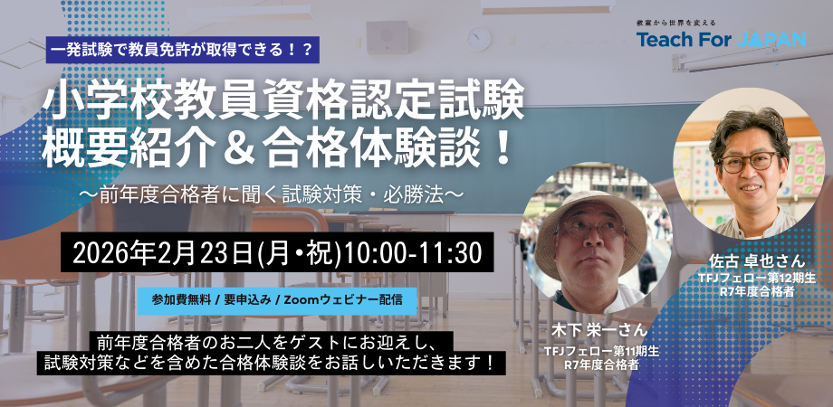 本イベントは、Teach For Japanが独自に主催するもので、教員資格認定試験の実施事務を行っている独立行政法人教職員支援機構とは関係ありません。